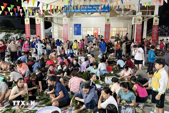 Đặc biệt, từ chiều 22 đến rạng sáng 23/11, hàng trăm người già, cựu chiến binh, thanh niên, phụ nữ, trẻ em đã tập trung trước sân để gói bánh chưng, bánh tét.
