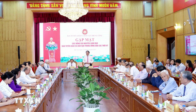 Ủy viên Bộ Chính trị, Bí thư Trung ương Đảng, Trưởng ban Tuyên giáo và Dân vận Trung ương Nguyễn Trọng Nghĩa chủ trì gặp mặt. Cùng dự có nguyên Chủ tịch nước Nguyễn Minh Triết.
