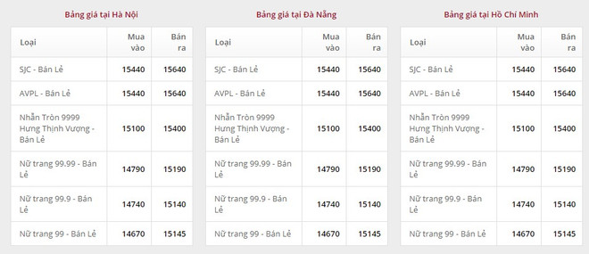 Giá vàng tại Công ty Trách nhiệm hữu hạn Một thành viên Vàng bạc đá quý Sài Gòn (SJC):