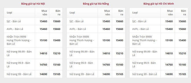 Dưới đây là bảng giá vàng tại một số công ty vàng bạc đá quý trong nước sáng 20/12: