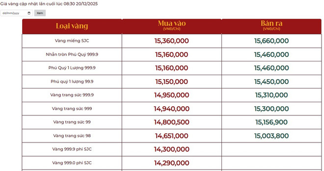 Cập nhật bảng giá vàng hôm nay (20/12) tại Công ty Trách nhiệm hữu hạn Một thành viên Vàng bạc Đá quý Sài Gòn (SJC), Công ty Cổ phần Đầu tư vàng Phú Quý, Tập đoàn Vàng bạc Đá quý Doji.