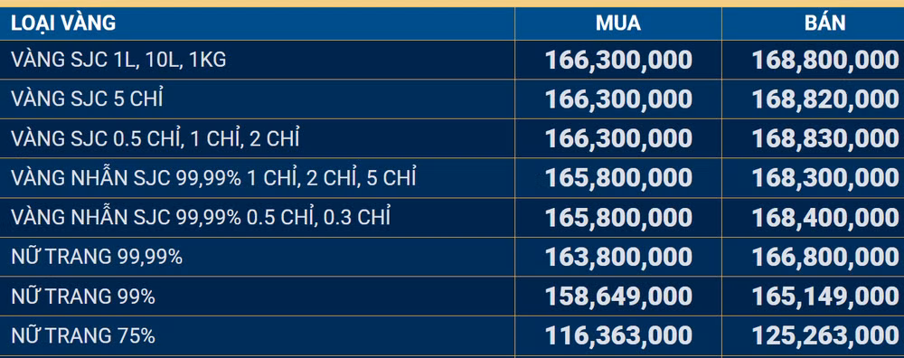 Giá vàng tại Công ty Trách nhiệm hữu hạn Một thành viên Vàng bạc đá quý Sài Gòn (SJC):