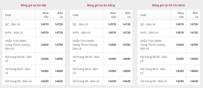 Giá vàng tại Công ty Trách nhiệm hữu hạn Một thành viên Vàng bạc đá quý Sài Gòn (SJC):
