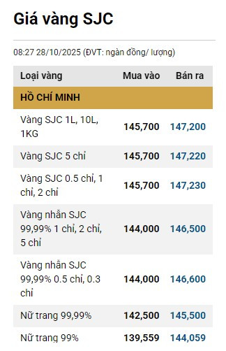 Cập nhật bảng giá vàng hôm nay (28/10) tại Công ty Trách nhiệm hữu hạn Một thành viên Vàng bạc Đá quý Sài Gòn (SJC), Công ty Cổ phần Đầu tư vàng Phú Quý, Tập đoàn Vàng bạc Đá quý Doji.