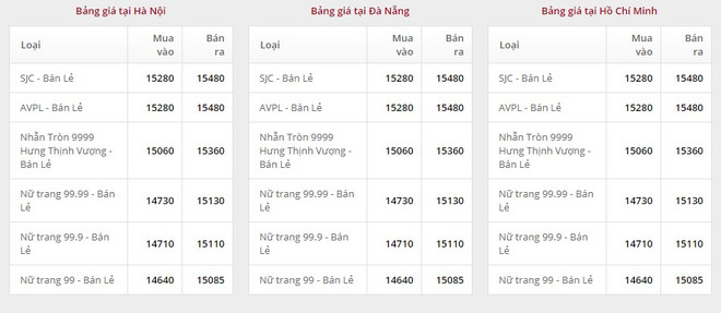 Dưới đây là bảng giá vàng tại một số công ty vàng bạc đá quý trong nước sáng 3/12: