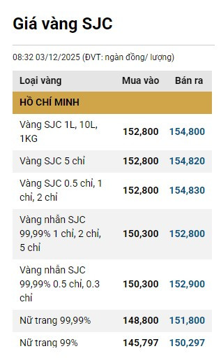 Tại Việt Nam, vào đầu giờ sáng 3/12, Công ty Vàng bạc đá quý Sài Gòn niêm yết giá vàng miếng SJC ở mức 152,5-154,5 triệu đồng/lượng (mua vào-bán ra).