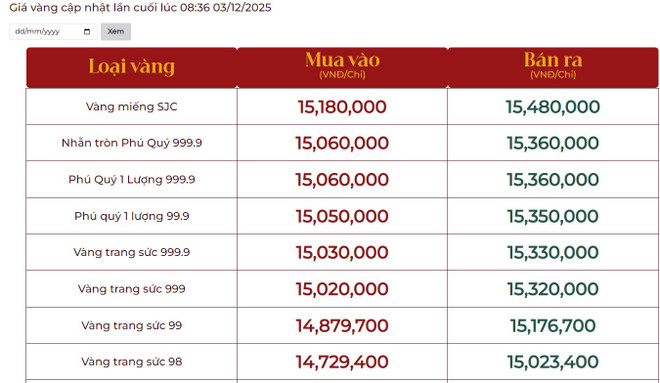 Cập nhật bảng giá vàng hôm nay (3/12) tại Công ty Trách nhiệm hữu hạn Một thành viên Vàng bạc Đá quý Sài Gòn (SJC), Công ty Cổ phần Đầu tư vàng Phú Quý, Tập đoàn Vàng bạc Đá quý Doji.