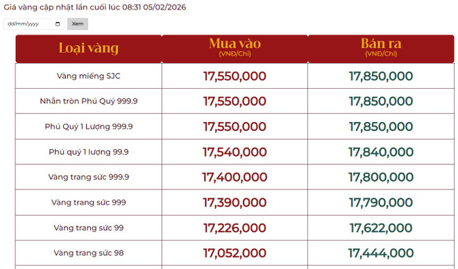 Cập nhật bảng giá vàng hôm nay (5/2) tại Công ty Trách nhiệm hữu hạn Một thành viên Vàng bạc Đá quý Sài Gòn (SJC), Công ty Cổ phần Đầu tư vàng Phú Quý.