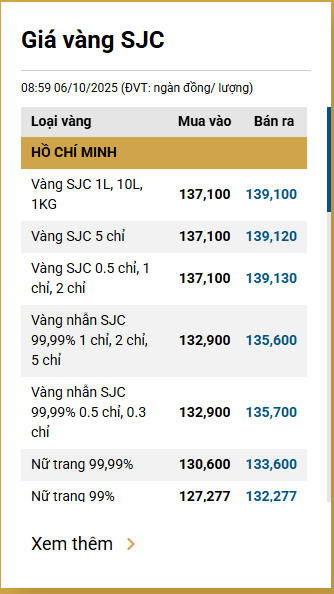Tại Việt Nam, sáng 6/10, Công ty Vàng bạc đá quý Sài Gòn (SJC) niêm yết giá vàng miếng ở mức 137,1-139,1 triệu đồng/lượng (mua vào-bán ra).
