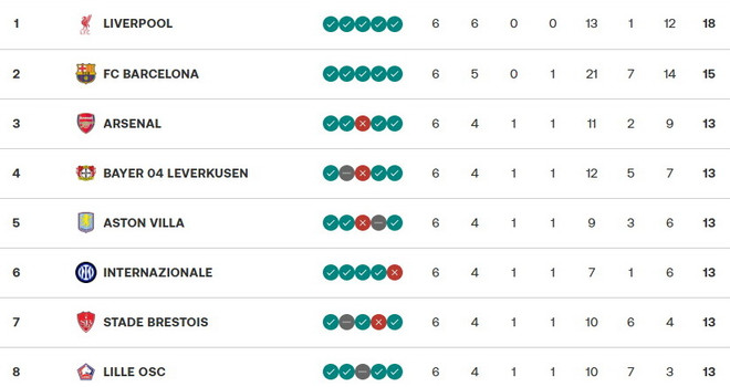 Top 8 hiện tại gồm có Liverpool (18 điểm), Barcelona (15 điểm), trong khi các đội bóng khác là Arsenal, Leverkusen, Aston Villa, Inter, Brest và Lille cùng có 13 điểm.