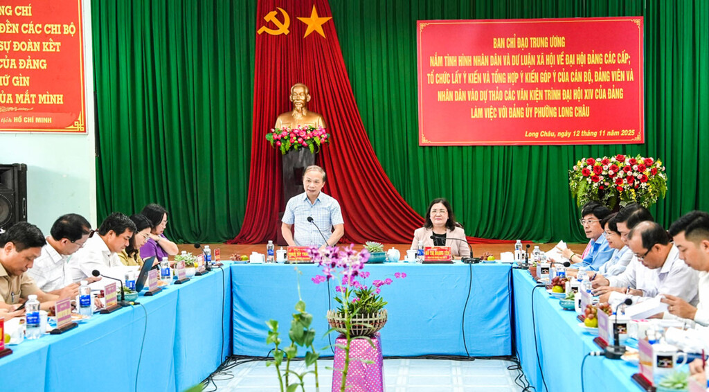 Tiếp tục chương trình khảo sát, nắm tình hình Nhân dân và dư luận xã hội về đại hội đảng bộ các cấp, tổ chức lấy ý kiến và tổng hợp ý kiến Nhân dân góp ý vào dự thảo các văn kiện trình Đại hội Đại biểu toàn quốc lần thứ XIV của Đảng tại các tỉnh Tây Nam Bộ, ngày 12/11, đồng chí Phạm Tất Thắng, Ủy viên Trung ương Đảng, Phó Trưởng ban Tuyên giáo và Dân vận Trung ương cùng Đoàn công tác làm việc với Đảng ủy phường Long Châu, tỉnh Vĩnh Long.