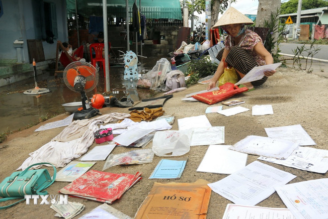 Cách đó không xa, nhà bà Nguyễn Thị Kim Anh (tổ 7, khu phố Kim Bình) cũng đang gấp rút thu dọn. Nước chưa rút hết, bà vẫn huy động con cháu tập trung dọn nhà với phương châm “nước rút tới đâu, vệ sinh tới đó." Nước ngập lâu, đồ đạc, nông sản trong nhà hư hỏng hết, mọi thứ vẫn còn rất lộn xộn nhưng bà Anh vẫn giữ tinh thần lạc quan.