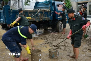 Từ sáng sớm, hàng nghìn người dân cùng lực lượng vũ trang đang hối hả dọn bùn non trong các căn nhà và trên các tuyến đường.