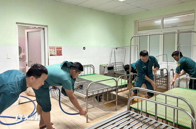 Chung tay, sát cánh dọn dẹp cùng các thầy cô giáo là hàng trăm cán bộ, chiến sỹ của Trường Quân sự Quân khu 5. Nhờ sức khỏe của lực lượng quân đội, chỉ trong sáng 31/10, hàng tấn bùn non đã được đẩy ra khỏi các lớp học và khu vực sân trường.