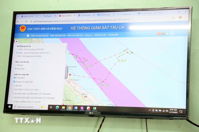 Hệ thống màn hình theo dõi tàu cá hoạt động 24/24, cập nhật liên tục vị trí, hướng di chuyển và tín hiệu kết nối thiết bị VMS. Khi phát hiện bất thường sẽ thông báo khắc phục ngay, kiên quyết không để tàu cá mất kết nối hay vượt ranh giới.