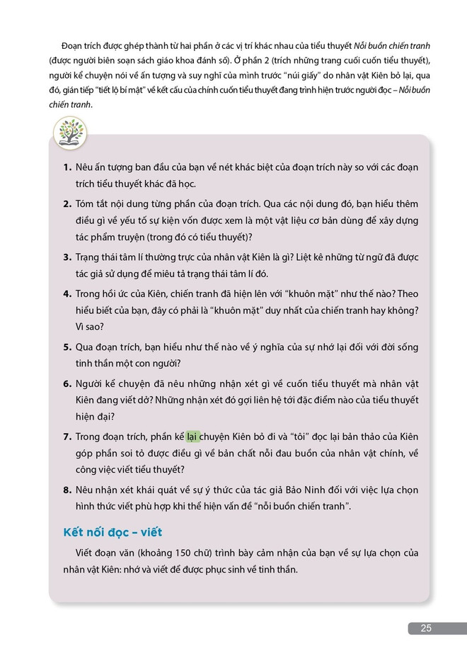 Chủ ý đó còn được thể hiện qua một câu hỏi đọc hiểu văn bản “Nỗi buồn chiến tranh”: Trong hồi ức của Kiên, chiến tranh đã hiện lên với “khuôn mặt” như thế nào? Theo hiểu biết của bạn, đây có phải là “khuôn mặt” duy nhất của chiến tranh hay không? Vì sao?