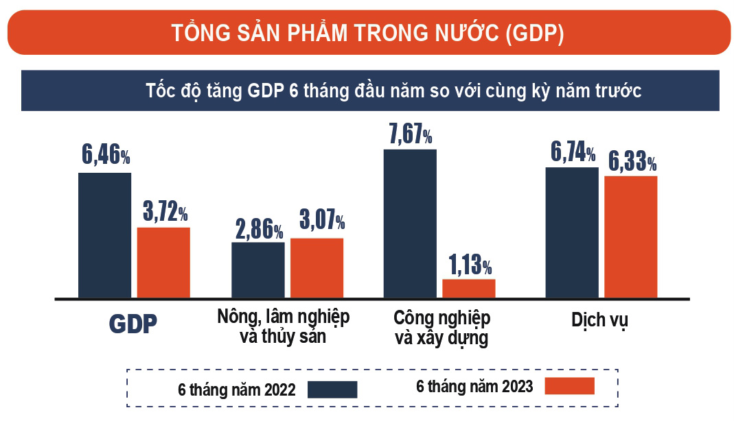 (1) Tăng trưởng kinh tế Quý II tích cực hơn nhưng vẫn gặp nhiều khó khăn. GDP quý II ước tăng 4,14% so với cùng kỳ năm trước, tính chung 06 tháng tăng 3,72%, thấp hơn kịch bản đề ra tại Nghị quyết số 01/NQ-CP (6,2%). Trong đó, khu vực công nghiệp - xây dựng 06 tháng chỉ tăng 1,13% (kịch bản tại Nghị quyết số 01/NQ-CP là 6,7%), tác động mạnh đến tăng trưởng chung của nền kinh tế.