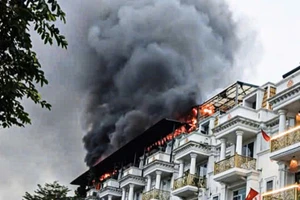 Đám cháy lớn bùng phát và ngọn lửa lan nhanh bao trùm nhiều căn nhà tại căn biệt thự liền kề ở Khu đô thị Geleximco Lê Trọng Tấn (Dương Nội, Hà Nội). -