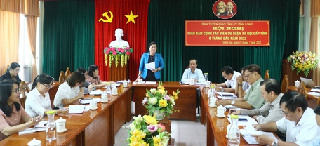 Đồng chí Nguyễn Thị Minh Trang, Trưởng Ban Tuyên giáo Tỉnh ủy Vĩnh Long đề nghị thời gian tới công tác nghiên cứu, nắm bắt và phản ánh dư luận xã hội cần tập trung vào những nội dung chủ yếu như tình hình tư tưởng, dư luận xã hội trong nội bộ và các tầng lớp Nhân dân xung quanh việc triển khai quán triệt, tuyên truyền Nghị quyết Đại hội Đảng lần thứ XIII; tình hình phát triển kinh tế- xã hội 6 tháng cuối năm; tư tưởng, dư luận xã hội nảy sinh trong quá trình thực hiện chủ trương, đường lối của Đảng, chính sách, pháp luật của Nhà nước; kết quả công tác quy hoạch cán bộ; dư luận xung quanh các ngày lễ, sự kiện lớn…